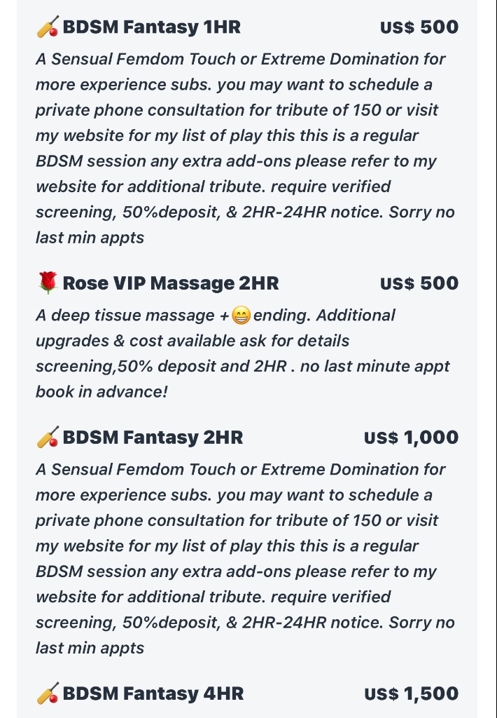 Hi High-End Caliber Suitors Over 40 I have a private incall in Westminster or I can host in your city or Visit your place & 2HR-4HR notice from your preferred appt time. 🌹Curvy Beauty || 5'2 || 170lbs || 38DDD 💆🏼Exotic Masseuse 🏏Sensual Dominatrix I’m Verified N Reviewed! Are You TNA:LadyChristian P411: P195430 PD: ebonyfemdomgoddess --------- My time is valuable, and so is yours. If screening & sending a deposit is not for you then I wish you the best with a less cautious lady.Text this info to speed up booking process 1.) Name,age,race 2.) The city you are in 3.) Meeting time & day of your session 4.) Session length/Session type 5.) Where did you see my post 6.) My Place or Yours Must be deposit ready upon contact All time wasters & no call no shows will be blocked. --------------------------- LADY ROSE TRIBUTES: Rose VIP Massage = 500 2HR Upgrades Avail in Rose VIP 4 additional tribute Reg BSDM Session= 1000 2HR Golden 🚿+100 Prostate Play or Pegging +100 --------------------------- NOTE: Please schedule your session a day before or at least two hours before your preferred meeting time. Any last minute appts is additional $50 added to your tribute. ❌Not texting all the booking info=Blocked ❌Calling my phone when it’s clear i said text only=Blocked CONTACT DETAILS: (TEXT ONLY)